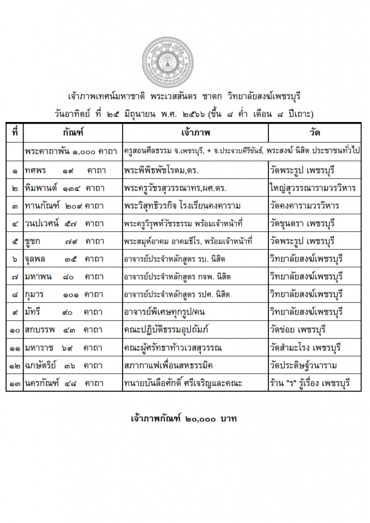 ขอเชิญเข้าร่วมโครงการสืบสานวัฒนธรรมทางพระพุทธศาสนาเทศน์มหาชาติ ด้วยมหาวิทยาลัยมหาจุฬาลงกรณราชวิทยาลัย วิทยาลัยสงฆ์เพชรบุรี ได้กำหนดจัดโครงการสืบสานวัฒนธรรมทางพระพุทธศาสนาเทศน์มหาชาติ ประจำปีงบประมาณ ๒๕๖๖ ในวันอาทิตย์ที่ ๒๕ มิถุนายน พ.ศ. ๒๕๖๖ เริ่มเวลา ๐๖.๐๐ น. เป็นต้นไป